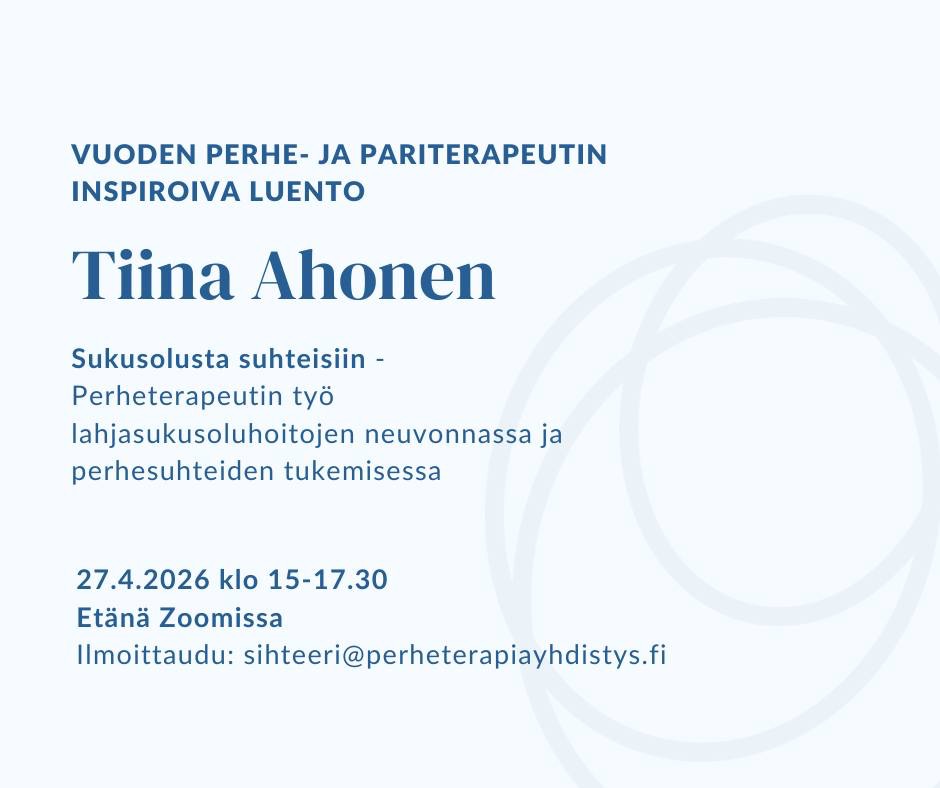 - Ma 27.4.26 klo 15-17.30 Vuoden perhe- ja pariterapeutti Tiina Ahonen inspiroiva luento: Sukusolusta suhteisiin – Perheterapeutin työ lahjasukusoluhoitojen neuvonnassa ja perhesuhteiden tukemisessa. Luento on jäsenille ilmainen. Ilmoittautuminen ZOOM- tapahtumaan: sihteeri@perheterapiayhdistys.fi